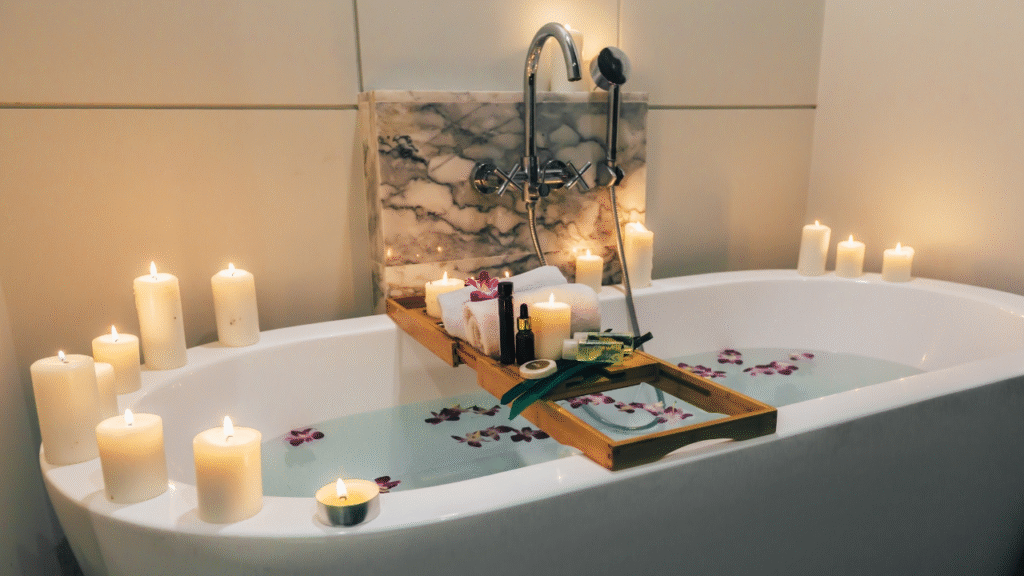 Thick cotton towels folded neatly. A subtle indoor plant that thrives in humidity. A candle lit during evening baths. Soft music playing quietly in the background.